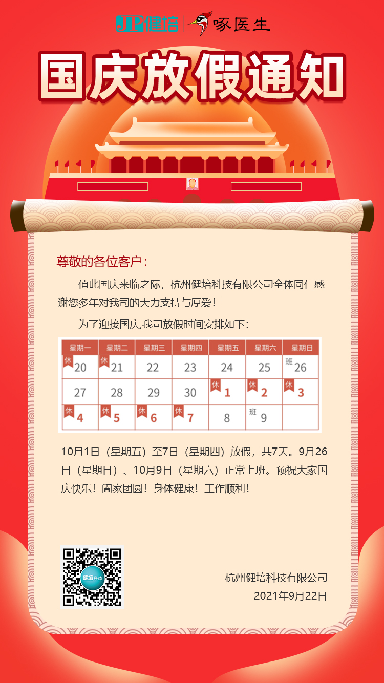 喜迎國慶,與AI相伴! 原創(chuàng) 健培科技2021/10/12 9:35:30 共譜盛世華章神州奮起,國家繁榮山河壯麗,歲月崢嶸江山不老,祖國常春值此國慶佳節(jié)之際健培祝祖國母親繁榮昌盛祝您和家人國慶節(jié)快樂!國慶節(jié)放假通知