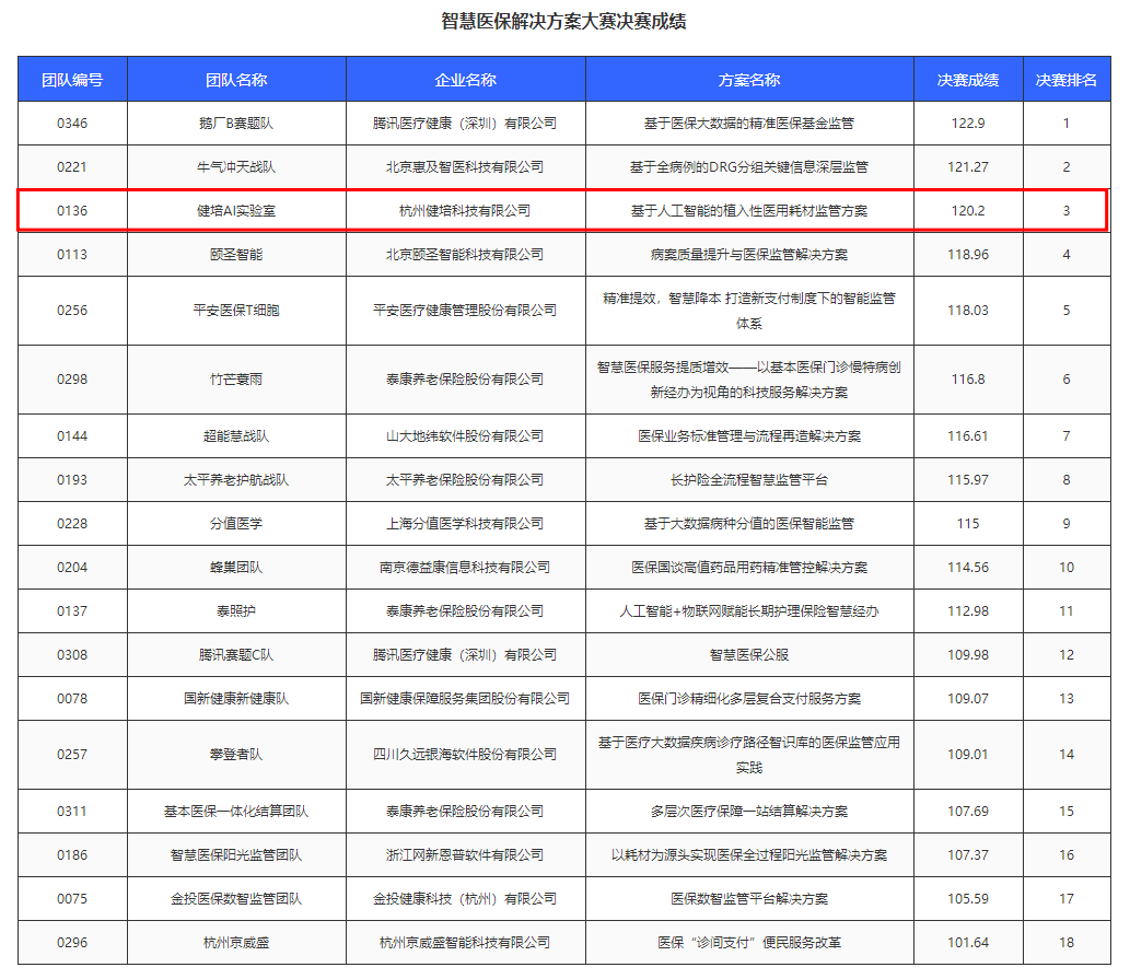 3月3日,國家醫(yī)保局智慧醫(yī)保解決方案大賽決賽成績正式對外公布, 健培AI實驗室《基于人工智能的植入性醫(yī)用耗材監(jiān)管方案》以120.2分的成績位列前三,榮獲一等獎。 此次比賽是國家醫(yī)保局貫徹落實黨中央“關(guān)于高度重視新一代信息技術(shù)在醫(yī)藥衛(wèi)生領(lǐng)域的應(yīng)用”要求的具體舉措,歷時近5個月,騰訊、阿里、百度、平安、泰康等133家企業(yè)的156個團(tuán)隊參與本次大賽,最終有18個方案入圍決賽。
