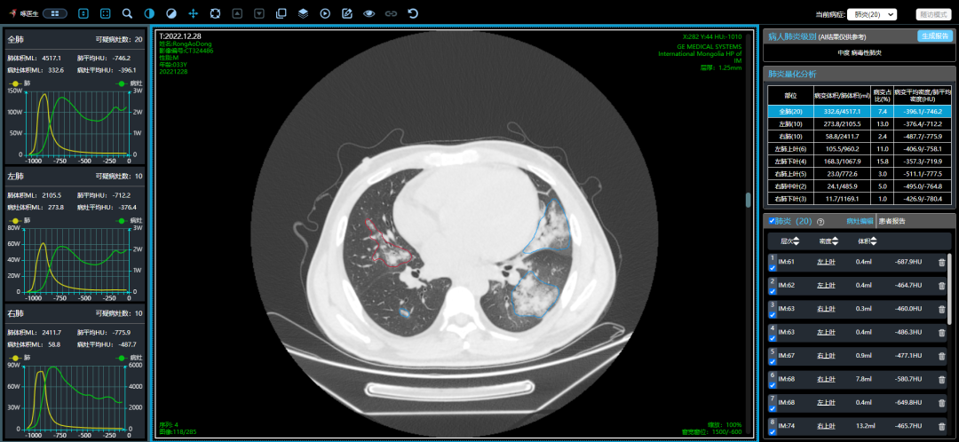 從這3個確診新冠肺炎呈“白肺”病例來看,“白肺”多見于老人、兒童以及帶有基礎病的新冠患者,病灶可發(fā)生在肺內(nèi)任何肺葉,病灶形態(tài)特點也是多樣化,符合病毒性肺炎的影像表現(xiàn)。從影像學角度出發(fā)重點在于快速評估病情,提升人工讀片的客觀性。 “啄醫(yī)生閱片機器人??新冠肺炎CT影像輔助分診與評估系統(tǒng)”可以準確地識別新冠肺炎的典型影像表現(xiàn)如雙肺外周胸膜下多發(fā)的磨玻璃影、小葉間隔增厚或合并鋪路石征等,對于部分患者由于影像表現(xiàn)早于臨床癥狀,更具有早期發(fā)現(xiàn)、早期診斷的優(yōu)勢。