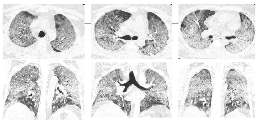 影像所見:發(fā)熱12天,胸悶、氣喘7天。胸部CT顯示兩肺彌散性磨玻璃影,呈“白肺”改變,其內(nèi)可見空氣支氣管征、雙側(cè)膈面上抬。