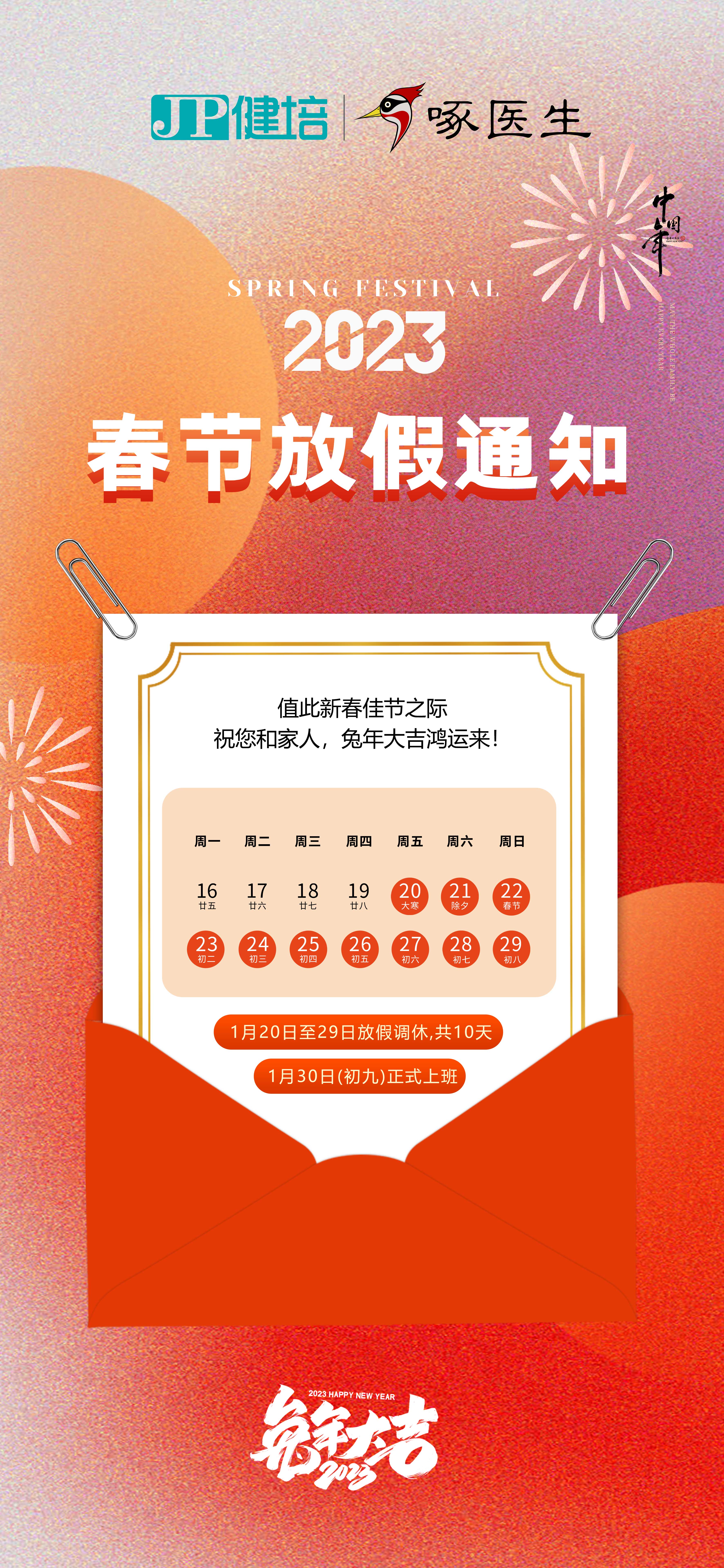 2023年1月20日至1月29日(初八)放假,共10天。1月30日(初九)正式上班。