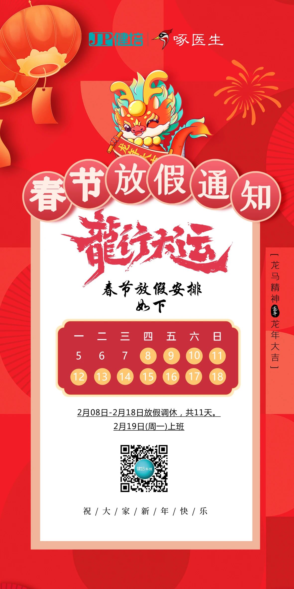 值此新春之際,預(yù)祝大家:龍騰四海,宏圖大展;龍騰虎躍,生龍活虎;龍飛鳳舞,財運(yùn)亨通;龍年大吉,萬事如意!