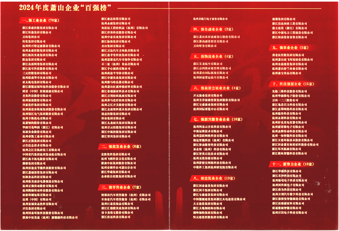 為進(jìn)一步推動(dòng)高質(zhì)量發(fā)展,鼓勵(lì)廣大企業(yè)在高質(zhì)量共富中扛起企業(yè)擔(dān)當(dāng),打造新時(shí)代共同富裕全域新標(biāo)桿,構(gòu)建優(yōu)勢(shì)互補(bǔ)、高質(zhì)量發(fā)展的區(qū)域經(jīng)濟(jì)布局,特認(rèn)定蕭山區(qū)百?gòu)?qiáng)企業(yè)。該榜單每年評(píng)選一次,旨在評(píng)選出蕭山區(qū)標(biāo)桿企業(yè),鼓勵(lì)企業(yè)做大做強(qiáng),著力增強(qiáng)企業(yè)創(chuàng)新能力,提升企業(yè)的綜合實(shí)力。萬(wàn)向集團(tuán)、傳化集團(tuán)、恒逸集團(tuán)、榮盛控股集團(tuán)等蕭山區(qū)知名企業(yè)皆入選榜單。