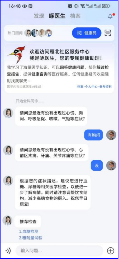 實(shí)例:患者輸入“口渴+多尿+持續(xù)一段時(shí)間”,系統(tǒng)如同醫(yī)生一樣通過(guò)簡(jiǎn)單對(duì)話追問(wèn)患者病情細(xì)節(jié),同步推送檢查和科室,并記錄患者問(wèn)診記錄。