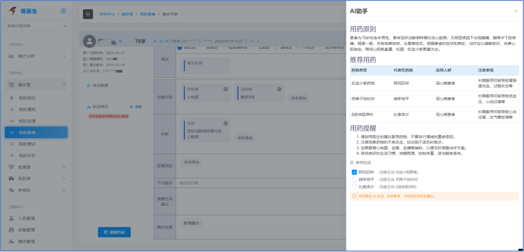 實(shí)例:根據(jù)患者患有冠狀動(dòng)脈粥樣硬化性心臟病,無(wú)明顯誘因下出現(xiàn)胸痛、胸骨中下段疼痛,程度一般,伴有咳嗽咳痰、頭暈等癥狀,提示用藥原則應(yīng)以緩解癥狀、改善心肌缺血、降低心肌耗氧量、抗凝、抗血小板聚集為主,推薦用藥列表(阿司匹林、硝苯地平、比索洛爾)和用藥提醒,醫(yī)生只需勾選操作就可以實(shí)現(xiàn)開(kāi)立藥囑。
