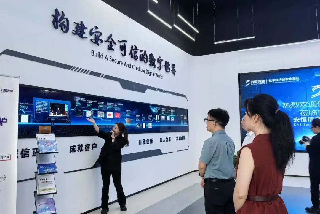 健培科技領導一行參觀了安恒信息安全創(chuàng)新體驗中心,詳細了解安恒信息的主營業(yè)務范圍、已取得的成果、企業(yè)文化建設等情況。展廳集中展示了安恒信息在網(wǎng)絡安全、數(shù)據(jù)安全、云安全、物聯(lián)網(wǎng)安全等領域的前沿技術與創(chuàng)新成果。