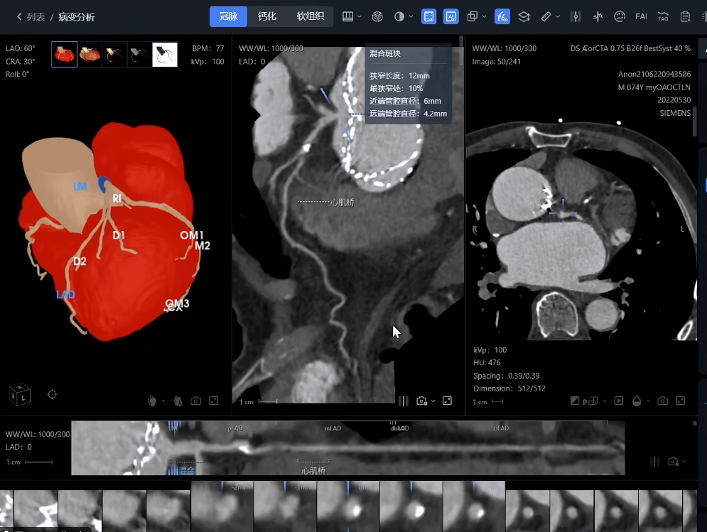 影像分析方面:系統能夠自動處理心血管CTA、腦血管MRA、外周血管超聲等多模態(tài)影像數據,精準識別斑塊性質、狹窄程度和病變范圍,生成結構化報告。