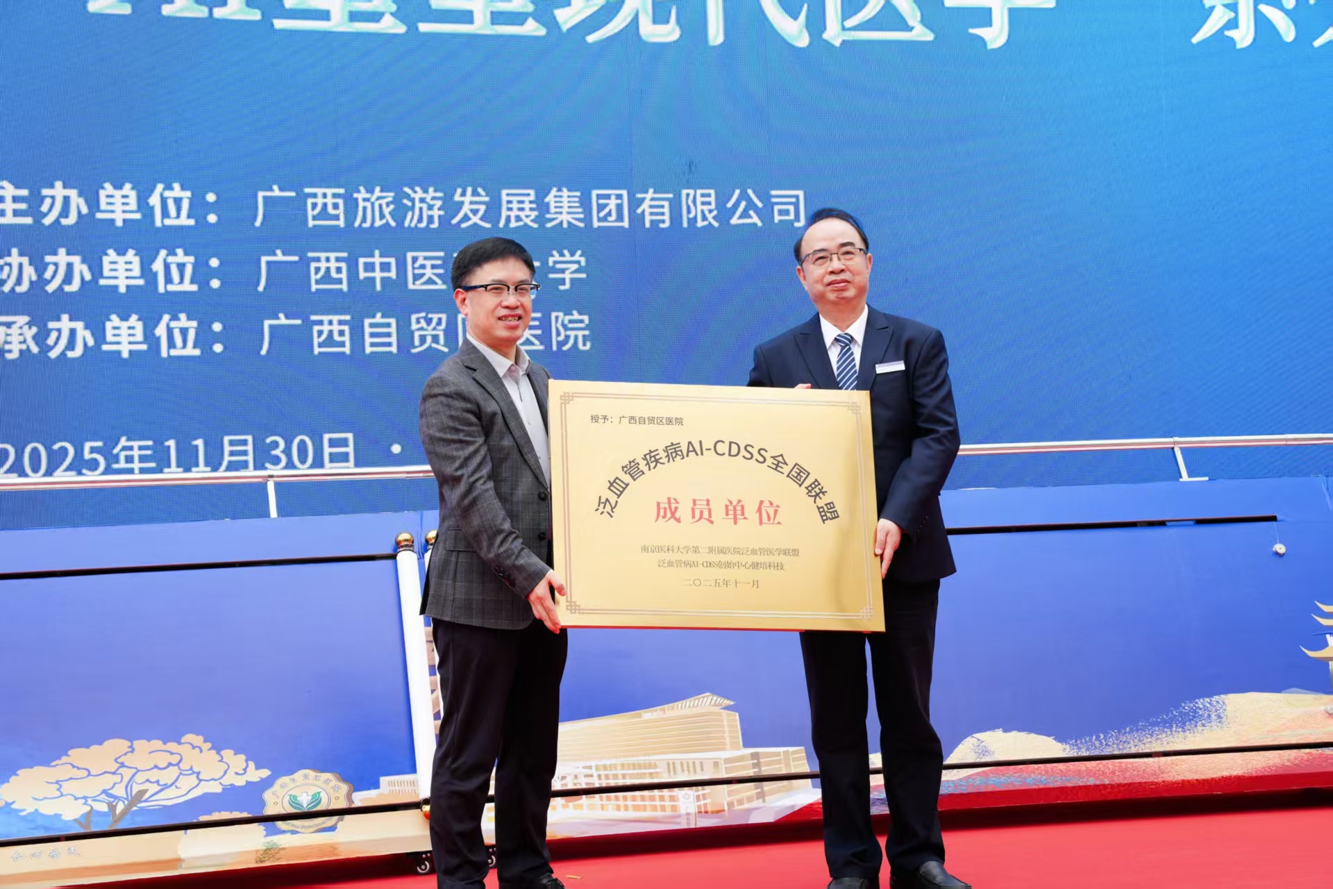 會上,舉辦了“泛血管疾病AI-CDSS全國聯(lián)盟成員單位”授牌儀式。聯(lián)盟單位發(fā)起人程國華教授向廣西自貿(mào)區(qū)醫(yī)院黨委副書記、院長黃貴華授牌。授予廣西自貿(mào)區(qū)醫(yī)院泛血管疾病AI-CDSS全國聯(lián)盟成員單位。
