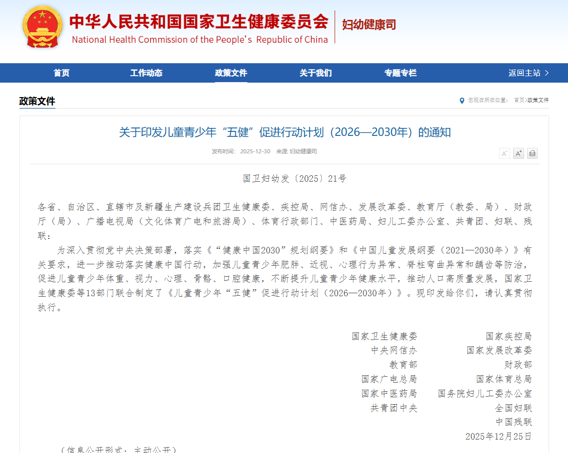 國(guó)家衛(wèi)生健康委等13部門發(fā)布《兒童青少年“五健”促進(jìn)行動(dòng)計(jì)劃(2026?2030年)》